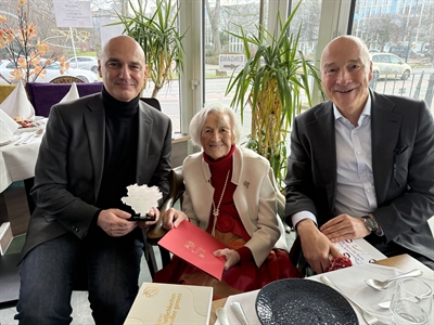 Oberbürgermeister Alexander Kalouti und Dr. Christian Jaaeger, Vorstandsvorsitzender der Spar- und Bauverein eG, gratulierten Marianne Haak zu ihrem 100. Geburtstag.