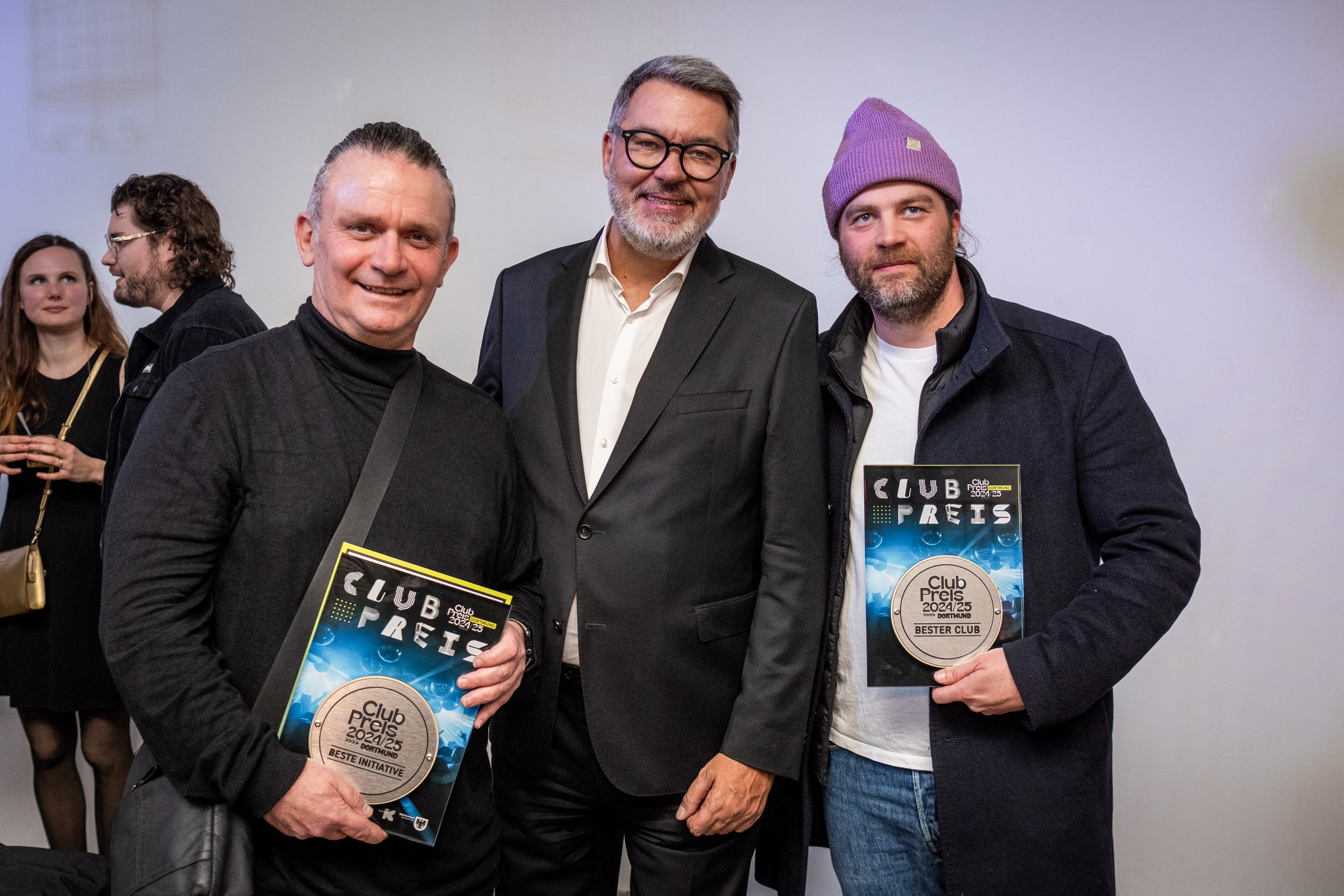Oberbürgermeister Thomas Westphal hat am gestrigen Donnerstag (20. Februar) ersten Dortmunder Clubpreis verliehen – 20.000 Euro bekommt „Oma Doris“ (mit Ben Bolderson, rechts) als bester Club, der „Stollen134“ (Udo Lagatz, links) erhält 10.000 Euro für die beste Initiative.
