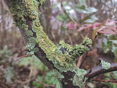 Oft findet man mehrere Flechten nebeneinander. Für die Fotobestimmung in ObsIdentify ist es wichtig, darauf zu achten, dass nur eine Flechte mittig im Bild platziert ist