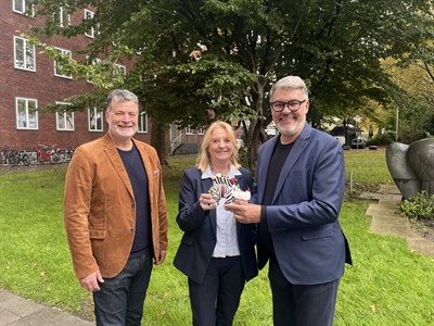 Oberbürgermeister Thomas Westphal und Hannah Rosenbaum, Bezirksbürgermeisterin Innenstadt-Nord überreichten ein Nordstadt-Herz aus Cortenstahl an Andreas Koch von der GrünBau gGmbH, die den Heimathafen Nordstadt betreibt.