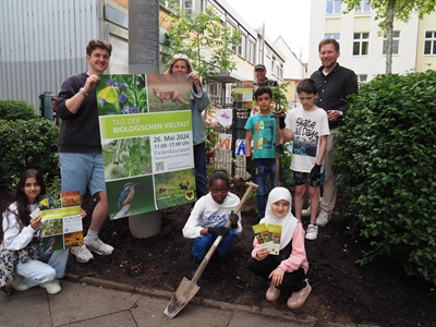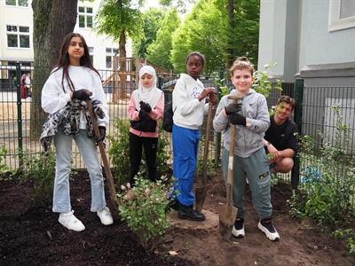 Bei einer Projektwoche haben die Kinder der Oesterholz-Grundschule sich jetzt mit Arten- und Naturschutz befasst. Bei der praktischen Arbeit, zum Beispiel beim Pflanzen von bienenfreundlichen Stauden, gab's Unterstützung durch Grünflächenamt und GrünBau gGmbh.
