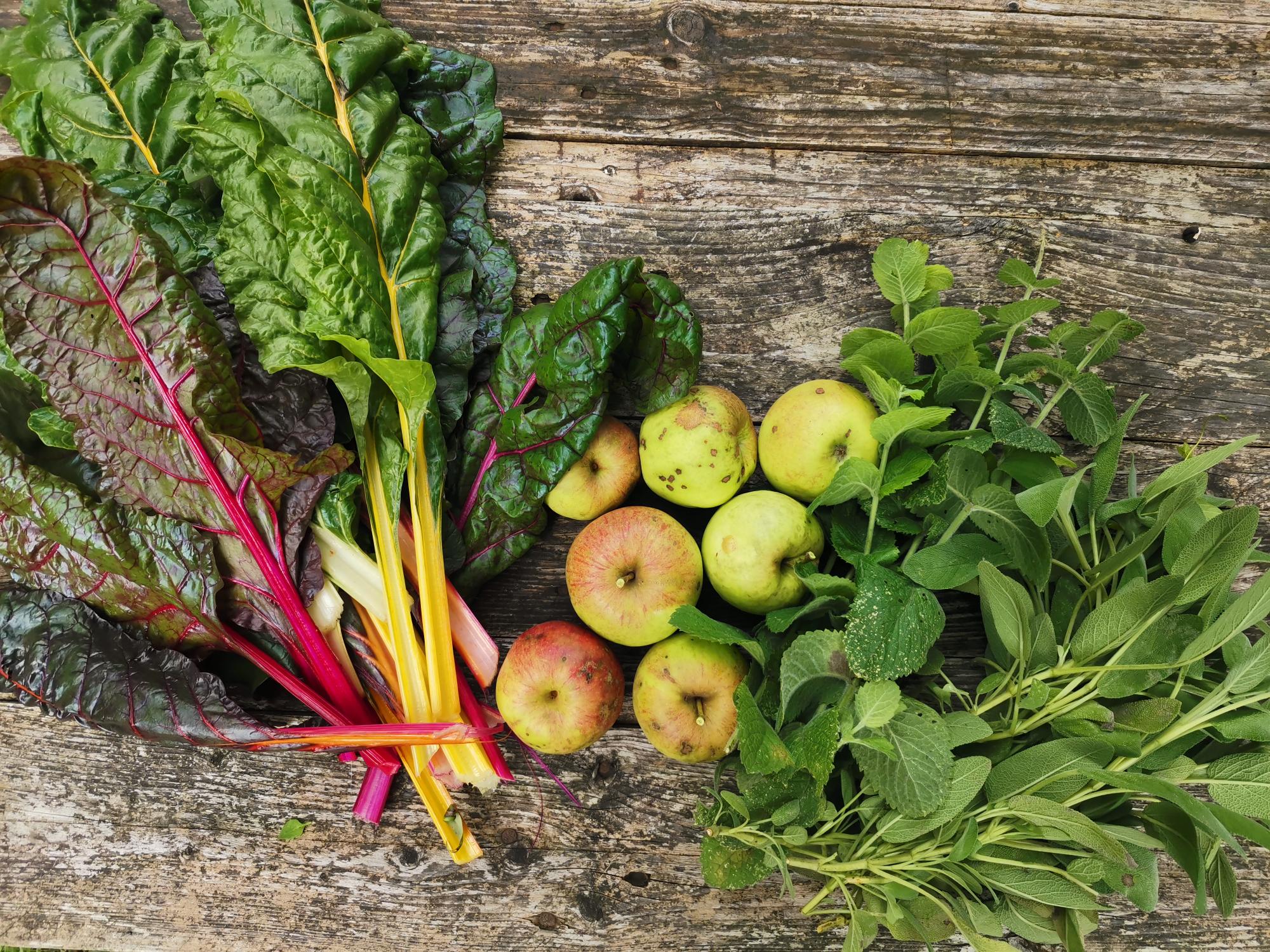 Mangold, Äpfel, Minze u. Salbei auf Holztisch