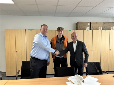 Jan Läzer (l.), Geschäftsführer der Dortmunder Eisenbahn GmbH, und Jörg Skubinn, Schulleiter der Marie-Reinders-Realschule, haben den Vertrag für die Bildungspartnerschaft unterschrieben. Ben Siegmann (M.) ist der erste Auszubildende durch diese Partnerschaft, die schon ein Jahr auf Probe lief. Ben ist im ersten Lehrjahr.