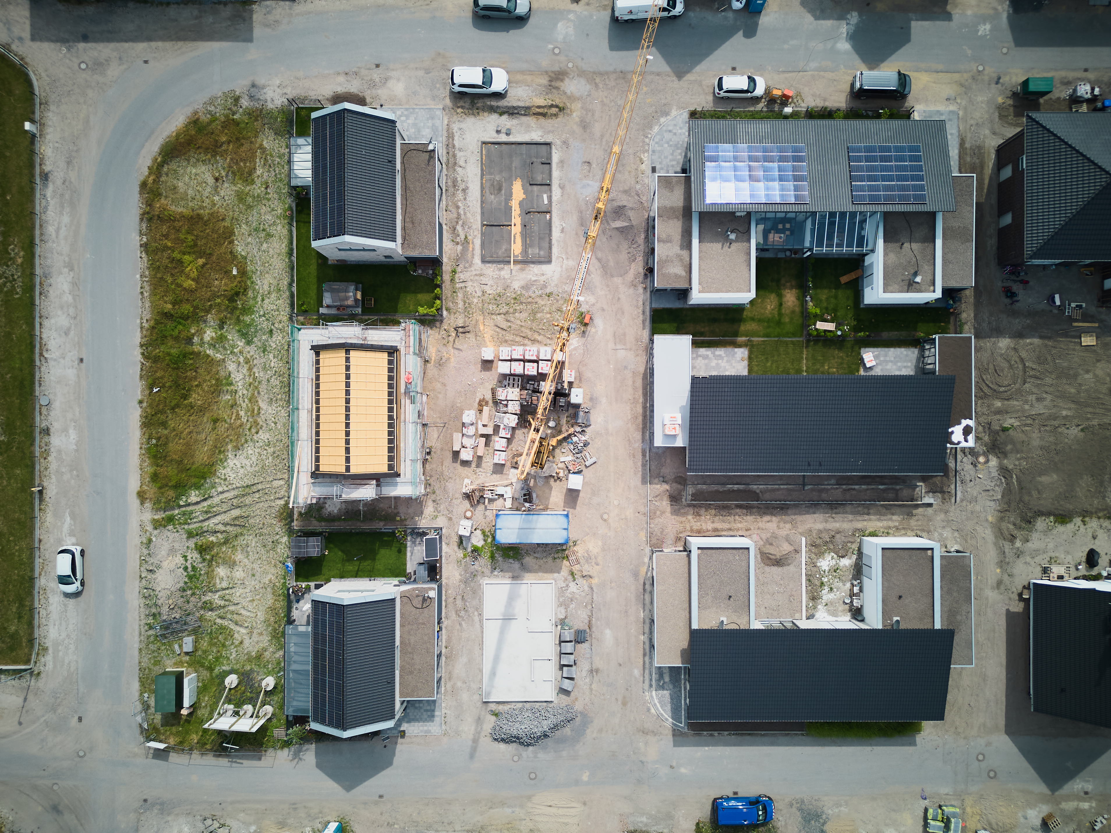 Seitenansicht der Siedlung mit kleinen Häusern in Südkirchen von STEINHOFFarchitekten