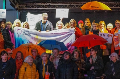 Statement-Aktion zum Start der "Orange Days" mit Oberbürgermeister Thomas Westphal und der Dortmunder Gleichstellungsbeauftragten Maresa Feldmann (4. v. li.) an der Reinoldikirche.