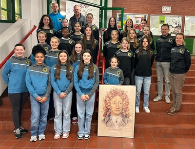 Übergabe neuer Sportkleidung an erfolgreiche Handballerinnen und Turnerinnen des Goethe-Gymnasiums.