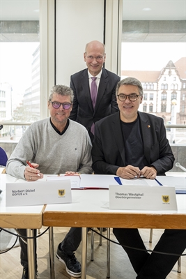 Norbert Dickel (Präsident GOFUS e.V.) und Oberbürgermeister Thomas Westphal unterzeichnen eine Kooperationsvereinbarung zum Bau und Unterhalt von Spiel- und Bolzplätzen in der Stadt. Bedeutend gefördert wird das Projekt von Prof. Tido Park.