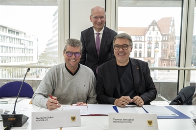 Norbert Dickel (Präsident GOFUS e.V.) und Oberbürgermeister Thomas Westphal unterzeichnen eine Kooperationsvereinbarung zum Bau und Unterhalt von Spiel- und Bolzplätzen in der Stadt. Bedeutend gefördert wird das Projekt von Prof. Tido Park.