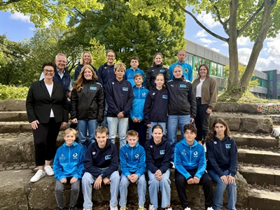 Viel Erfolg wünschten den Schwimmer*innen vom Goethe-Gymnasium Stephanie Pieczka (Sparkasse Dortmund), Christof Nattkemper (Schulleiter Goethe-Gymnasium), Birte Fischer (Lehrerin Goethe-Gymnasium, Mannschaftsbetreuerin), Henrik Ziethoff (Ausschuss für den Schulsport), Julia Hämel (Leitung OSP NRW/Westfalen; v.l.n.r.)