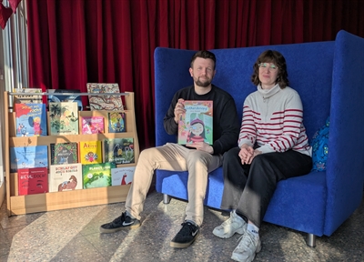 Die Sozialarbeiter*innen David Kilian und Katharina Brauer präsentieren die neue mobile Bücherstation im Regenbogenhaus.
