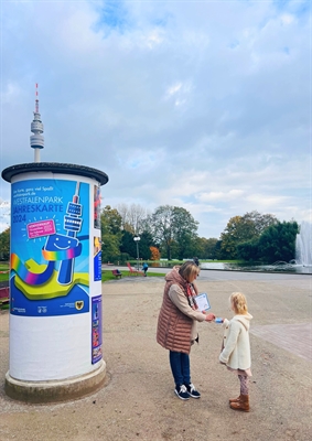 Westfalenpark: Die Gestalterin der Jahreskarte 2024, Adeline, schaut auf ihr Exemplar