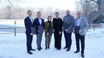 Von links: Sascha Dorday (Wirtschschaftsförderungsgesellschaft für den Kreis Unna mbH), Dr. Christopher Schmitt (HAGEN.Wirtschaftsentwicklung GmbH), Heike Marzen (Wirtschaftsförderung Dortmund), NRW-Wirtschaftsministerin Mona Neubaur, Pascal Ledune (IMPULS. Die Hammer Wirtschaftsagentur GmbH), Rouven Beeck (Bochum Wirtschaftsentwicklung)
