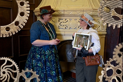 Zwei Teilnehmerinnen des Steampunk-Stammtischs im passenden Outfit.