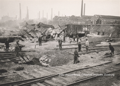 Blick vom Portierhaus auf die Zeche Kaiserstuhl und das Stahlwerk Hoesch in den 1930er-Jahren, festgehalten in einem historischen Foto aus dem Bestand des Hoesch-Museums.