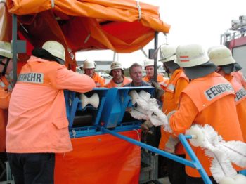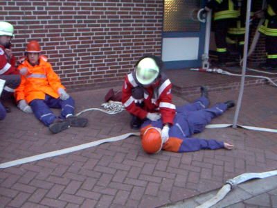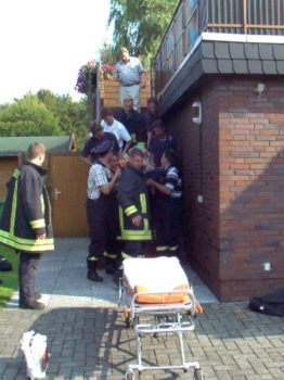 Mit vereinten Kräften wird der Patient zum Rettungswagen gebracht |