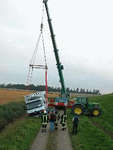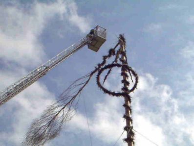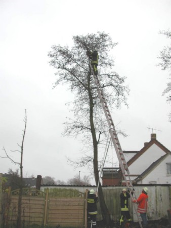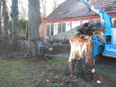 Mit Mannschaftszug und Autokran wird der Stamm vom Haus entfernt |