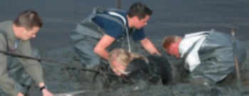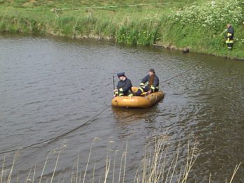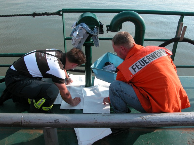 Anbringen des Vliesstoffes an der Ölsperre - deutlicher Ölfilm erkennbar |