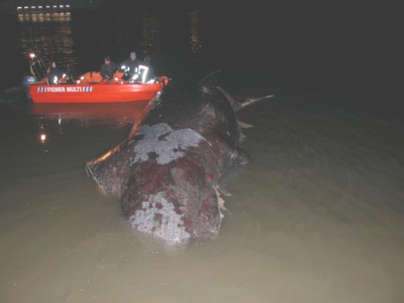 Mit dem Feuerwehrboot wird der 2. Wal an die Kaimauer gedrückt. |