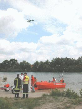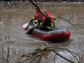 Mitglieder des THW setzen Besucher über das Galgentief |