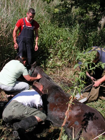 Mit Hilfe der Feuerwehr kann das Pferd gerettet werden |