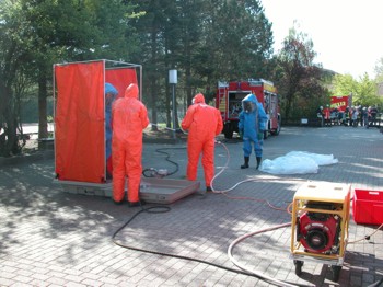 Atemschutzgeräteträger sichern beschädigte Kanister gegen weiteres Auslaufen |