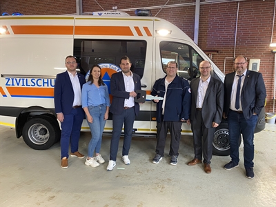 Die offizielle Übergabe des neuen KTW Typ B fand in der Fahrzeughalle des DRK-Ortsvereins Reken statt: v. li.: Lucas Finke (Leiter Nationale Hilfsgesellschaft DRK Kreisverband Borken), Katharina Schroer (Fachabteilungsleiterin Gefahrenabwehr, Kreis Borken), Hendrik Schuurmann (Leiter Fachbereich Sicherheit und Ordnung, Kreis Borken), Stefan Niewerth (Rotkreuzleiter DRK-Ortsverein Reken), Christian Nordendorf (Vorsitzender DRK-Ortsverein Reken) und Manuel Deitert (Bürgermeister Reken)