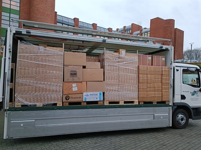 Ein Fahrzeug der Firma Voßkamp holte die Spenden für die Ukraine-Hilfe am Kreishaus ab.