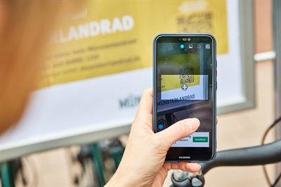 Einfach den QR-Code am Fahrradständer scannen und mieten, bezahlen, aufschließen, losfahren. Scannen eines QR-Codes © Münsterland e.V./Philipp Fölting