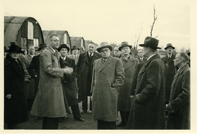 Grenzlandbesuch der Landesregierung mit Ministerpräsident Karl Arnold (5. v. l., mit Hut), Kultusministerin Christine Teusch (1. v. l.), Justizminister Dr. Artur Sträter (8. v. l.) und Landwirtschaftsminister Heinrich Lübke am 22.11.1948 in Bocholt, der Bocholter Stadtdirektor Ludwig Kayser (4. v. l.) und der Borkener Landrat Hans Renzel (4. v. r.) machen auf zerstörte Gebäude und die Nissenhütten an der Kurfürstenstraße für die Volksschule aufmerksam. Bildarchiv Kreis Borken SF 910