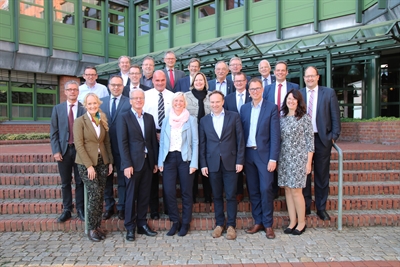 Im Borkener Kreishaus kamen auf Einladung von Landrat Dr. Kai Zwicker (vorne, 3. v. re.) die Bürgermeisterinnen und Bürgermeister mit den Spitzen der Kreisverwaltung, der EGW und der WFG zusammen.