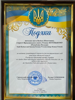 In einer Urkunde mit bewegendem Text dankt der Bürgermeister von Sarny für die Hilfe aus den beiden Partnerkreisen Wroclaw/Breslau und Borken