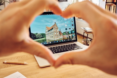 Bildschönes Münsterland! Wer seine Region liebt, kann sie sich auf den Schirm holen. Hände formen Herz vor Bildschirm mit Burg © Münsterland e.V./Philipp Fölting
