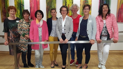 (1. Reihe v. li.) Ute Isferding zuständige Koordinatorin beim Kreis Borken, Jule Wanders, Stadt Bocholt, (2. Reihe v. li.) Britta Drewitz, Kulturbüro Gronau, Simon Schwerhoff, Stadt Borken, und Elisabeth Büning, Leiterin des Fachbereichs Bildung, Schule, Kultur und Sport des Kreises Borken, bewerben das Landesprogramm "Kultur und Schule" NRW.