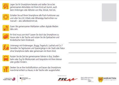 Die DINA 3-formatigen Motivplakate der Kampagne sowie die Postkarten „Handygarten“ sind kostenfrei bei Heike Kubow vom Kinder- und Jugendschutz des Landkreises Peine unter der Rufnummer 05171/40130066 oder per Mail an: kubow@landkreis-peine.de erhältlich.