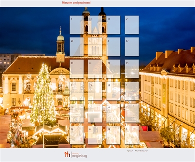 Vom 1. bis 24. Dezember können alle Besucherinnen und Besucher der städtischen Homepage unter www.magdeburg.de und der Facebook-Fanpage in einem virtuellen Adventskalender täglich ein Türchen öffnen. Dahinter verbergen sich Fragen und Informationen zur Landeshauptstadt Magdeburg und ihrer ereignisreichen Geschichte. Gefragt wird zum Beispiel, wo sich der Kaiser-Otto-Saal befindet, wann das Erzbistum Magdeburg errichtet wurde oder auch wie viele Quadratmeter die Ausstellungsfläche des neuen Dommuseums Ottonianum Magdeburg umfasst.
