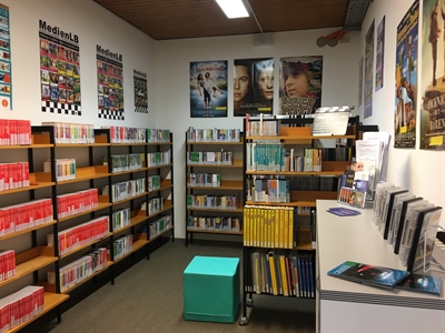 Um die jeweiligen Bestände besser zu unterscheiden, sind die Medien der Bildstelle in einem eigenen Raum untergebracht. Der augenzwinkernd auch als „Hinterzimmer“ bezeichnete Bereich ist dabei ein echter Hingucker geworden: Requisiten wie Regieklappen und Filmplakate verleihen ihm einen nostalgischen Charme, der Erinnerungen an Videotheken weckt.
