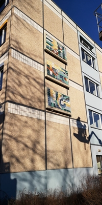 Nach einer Idee der Künstlerin Dagmar Schmidt, die im Auftrag des Stadtplanungsamtes den Umzug begleitet hat, wurden die Hauszeichen nun an der Schule platziert. Der Umzug wurde von der Wobau unterstützt. Demnächst ist auch eine feierliche Übergabe geplant.