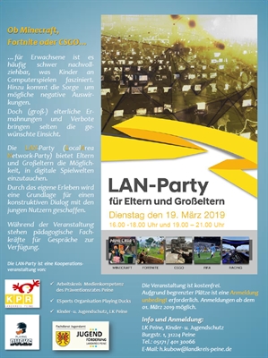 Der Kinder- und Jugendschutz des Landkreises Peine veranstaltet in Kooperation mit dem Arbeitskreis Medienkompetenz des Präventionsrates im Kreis Peine und der Peiner ESports Organisation Playing Ducks am 19. März, in der Zeit von 16 bis 18 Uhr sowie von 19 bis 21 Uhr, eine LAN-Party (LocalArea Network-Party) in den Räumlichkeiten der Playing Ducks.