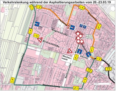 Von den Arbeiten werden auch die Einmündungsbereiche der Mozartstraße, Wagnerstraße, Catharinen- und Bernhardstraße betroffen sein, die in dem genannten Zeitraum ebenso wie die Poststraße für den Kraftfahrzeugverkehr voll gesperrt werden müssen. Diese Vollsperrungen bedingen, dass der innerstädtische Verkehr an mehreren Stellen umgeleitet werden muss (siehe Verkehrslenkungsübersicht unten).
