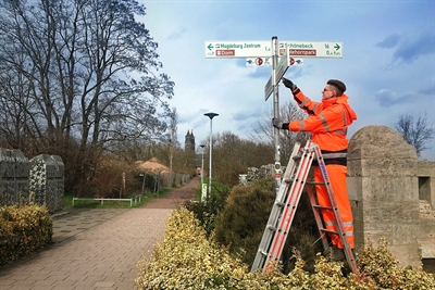 Die Beschilderung des Elberadweges ist in Magdeburg komplett überarbeitet und erneuert worden. Pünktlich zum Beginn der neuen Fahrradsaison wurden in der gesamten Stadt 100 Wegweiser an 41 verschiedenen Standorten ausgetauscht.