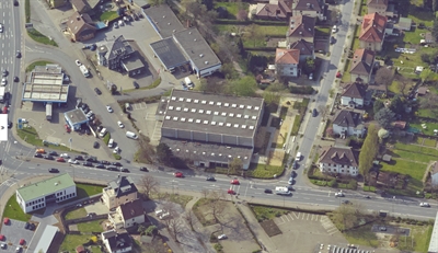 Bildzeile 2: So sieht die Halle derzeit aus der Luft aus. Gut zu erkennen: Der dunkle, kleine Eingangsbereich. Grafik Kreis Unna - Vermessung und Kataster