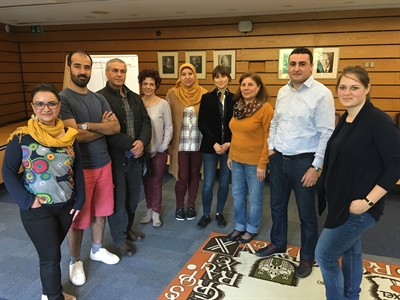 | Neda Mehrabi-Neumann (2. v. l.) und Alexandra Schmitz (3. v. l.) vom Kommunalen Integrationszentrum gemeinsam mit Dozentin Dr. Natalia Tilton (2. v. r.) und der zweiten Schulungsgruppe. |