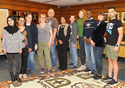 | Neda Mehrabi-Neumann (l.) und Alexandra Schmitz (r.) vom Kommunalen Integrationszentrum gemeinsam mit Dozentin Dr. Natalia Tilton (4. v. r.) und den Teilnehmern der ersten Sprachmittler-Schulung im Kreishaus. |