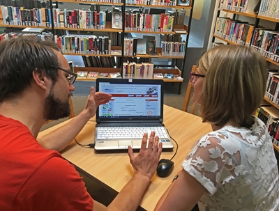 Auszubildender Benjamin Heibutzki und die Fachangestellte für Medien- und Informationsdienste Susann Mattern mit der geöffneten Homepage der Onleihe des Verbundes NBib24.