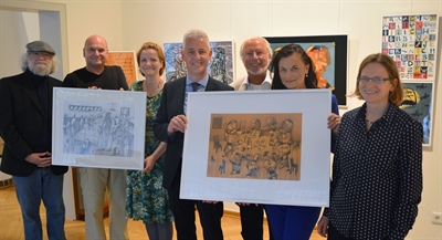 Bei der Übergabe der Haggadah im Kunsthaus Leer: Die Künstler Daniel Jelin (v. l.), Ricardo Fuhrmann, Susanne Bracht, Leiterin der Ehemaligen Jüdischen Schule, Landrat Matthias Groote, Wolfgang Freitag, Vorsitzender der Deutsch-Israelischen Gesellschaft e.V. Arbeitsgemeinschaft Ostfriesland, Vizepräsidentin der Deutsch-Israelischen Gesellschaft und Bundestagsabgeordnete Gitta Connemann und Susanne Augat, Leiterin des Kunsthauses Leer.