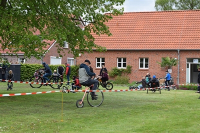 Der Sportverein Frisia Loga präsentiert eine Vielfalt an Sportangeboten und Sportgeräten zum Ausprobieren. Ein Imker und das Wallheckenzentrum sind vor Ort. Passend zur aktuellen Sonderausstellung „Als das Fahrrad laufen lernte“ können eine Vielzahl an Spaßrädern ausprobiert und das Boulefeld im Schlosspark bespielt werden. Gemeinsam mit den Mitarbeitern des Schlosses können alte Kartoffelsorten geerntet und am Kartoffelfeuer probiert werden.