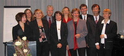 Das RAA-Team beim Jubiläum 2004 mit NRW-Sozialministerin Birgit Fischer (4.v.r.), Landrat Michael Makiolla (3.v.r.), Sozialdezernentin Gabriele Warminski-Leitheußer (Mitte, 2. Reihe) und Fachbereichsleiter Norbert Hahn (4.v.l.). Foto: Kreis Unna