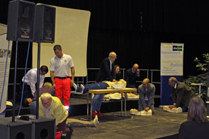 Auch Bürgermeister Fred Toplak informierte sich rund um das Thema „Plötzlicher Herztod“ und erprobte sich unter Anleitung des DRK an einer Herzdruckmassage. Darüber hinaus erklärten Fachärzte des St. Elisabeth-Hospitals vorbeugende Maßnahmen: Gesunde Ernährung, Sport und der Verzicht auf Nikotin senken die Risiken einer Herz-Kreislauf-Erkrankung erheblich.