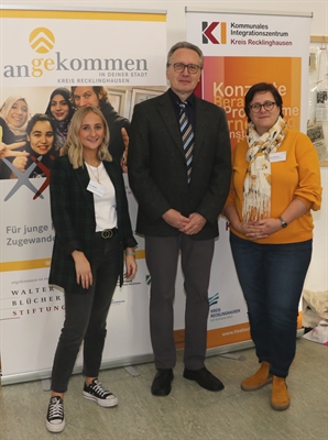 | Kerstin Liemann vom Kommunalen Integrationszentrum des Kreises Recklinghausen und Organisatorin des "Markt der Möglichkeiten" (r.), Wolfgang Krämer, Leiter des Kommunalen Integrationszentrums und Rebecca Welke vom Projekt "angekommen in deiner Stadt - Kreis Recklinghausen" (l.) vermittelten den neu zugewanderten Schülerinnen und Schülern Ansprechpartner für Ausbildung und Beruf. |