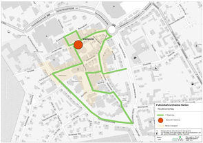 Glashaus – von der Hermannstraße ein Abstecher auf die Blumenstraße und dann Richtung Kreisverkehr – Ewaldstraße mit einem Umweg über den Marktplatz bis zur Kreuzung Kurt-Schumacher-Straße/Ewaldstraße – über Kurt-Schumacher-Straße und Antoniusstraße zurück zur Hermannstraße